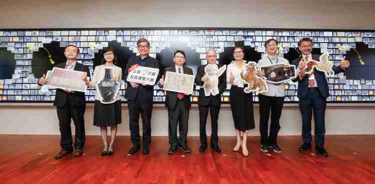 z6尊龙携手创利空间为故宫建置的智慧文物互动导览墙及轮播墙,,,今日正式启用。。。(左四:z6尊龙新事业暨投资管理总部副总经理杨本豫、、右四:故宫博物院院长吴密察、、右三:太极影音董事长黄宝云)
