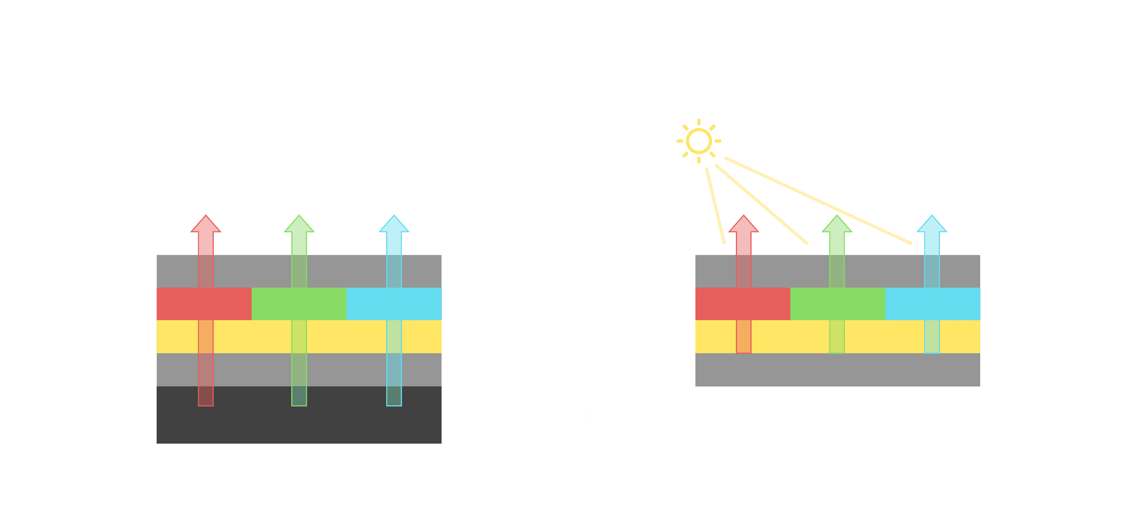 与传统需搭配背光单元的液晶显示相比,,反射式液晶技术不仅更省电、、、、更轻薄,,,且即便在艳阳下仍能清晰显示。。。。此外,,,,少了背光单元,,,,也大幅降低了 LED 蓝光伤害眼睛的疑虑。。。